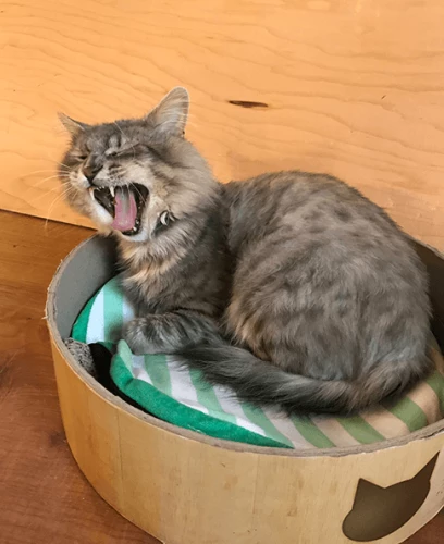 Albert is definitely a people person. He loves to hug, make biscuits and purr. He is looking for a best friend, or a pride of really loyal friends. He is constantly greeting our guests and rubbing up against legs.
