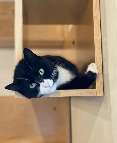 This lovable little fluffball is what we'd call an aggressive cuddler. You'll bend down to pick something up off the ground and there she'll be, demanding snuggles. Freda is always in search of a warm lap and a treat to match! Plus, her stunning black and white pattern make her a purrrfect supermeowdel. Freda has tested positive for FeLV.