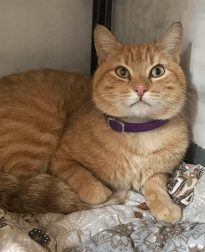 Max has a vibrant orange coat with a purrrrsonality to match. Quiet but demanding, this gentle soul adores attention and will follow you from room to room like a shadow. He just wants to love you! Max has tested positive for FeLV.