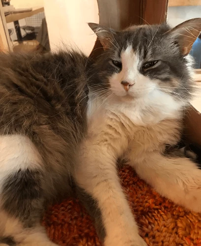 Fluffy Ollie is a little love bug. He loves attention and is often found grooming his pal Daisy. Oliver came to us from North Carolina in hopes of finding a forever home in the PNW. He will quickly steal your heart with his green eyes and head butts. Come meet Ollie soon! He has tested positive for FeLV.