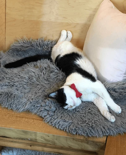 Roy is beyond special. He reminds us of Huckleberry Finn by the way he feels and reads the room, which is usually in a majestic harmony with his surroundings and environment. He is also hilarious. Like really hilarious and plays so well with all the kitties at the cafe. Roy has tested positive for FeLV.