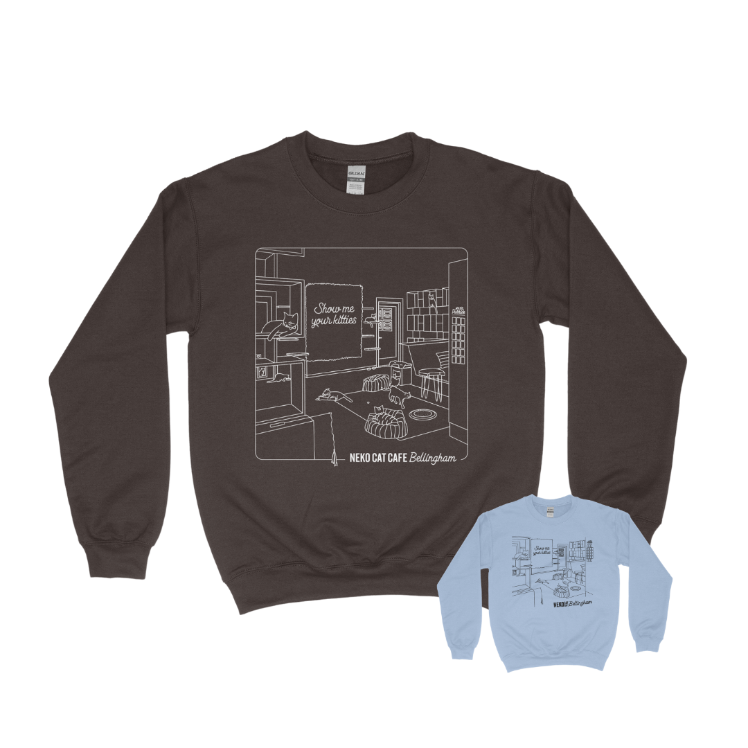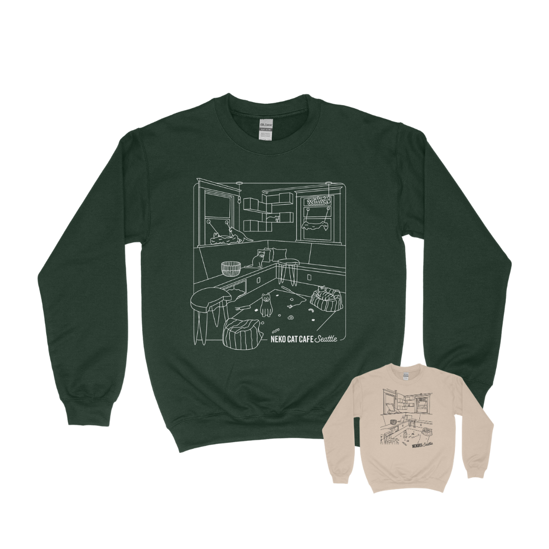 One of our favorite looks just got a refuresh! Our Cat Room Crewnecks, featuring the cutest illustrations of each cat room, are BACK in all-mew forest green (Seattle) and dark chocolate brown (Bellingham). They're just comfy, classic sweatshirts that never leave our outfit rotations. Plus, they take us back to our kitty-filled happy place! These earthy new colors are each available at the cafe they repurrsent, but you can shop both online!